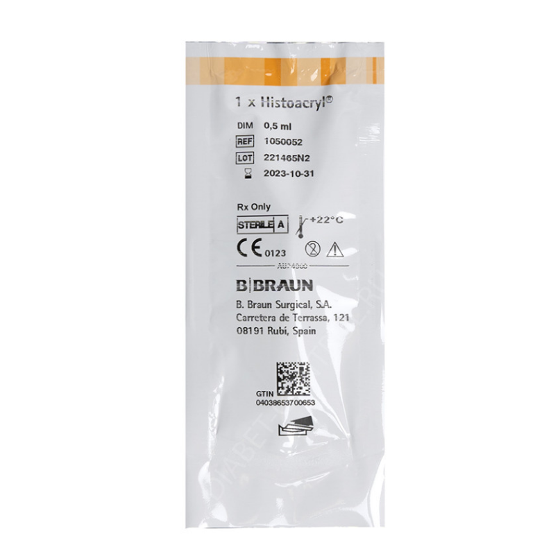The tissue adhesive Histoacryl® consists of monomeric n-butyl-2-cyanoacrylate, which polymerises quickly in connection with tissue fluid. Histoacryl® is available in two colours: translucent, special for facial application, and blue, which enables an easy control over the quantity applied in different indications approved.