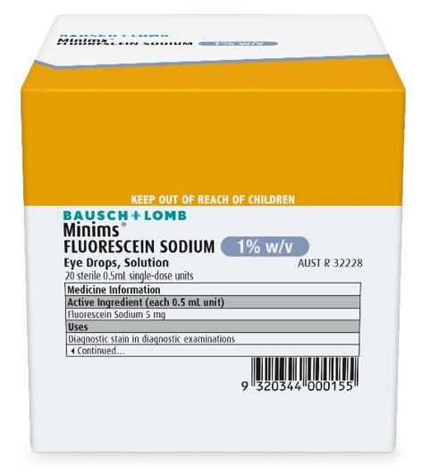 • Minims Fluorescein sodium 1.0% contains a diagnostic agent. The active substance, fluorescein sodium, is a temporary dye. Scratches on the conjunctiva are stained yellow or orange by fluorescein. Damages to the cornea are stained green. Any foreign bodies which are stuck in your eye are surrounded by a green ring.
