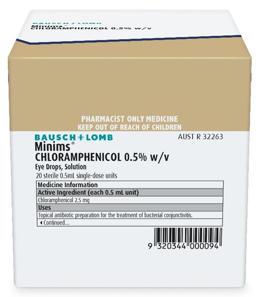 • Minims Chloramphenicol 0.5% Eye Drops are for the treatment of bacterial conjunctivitis. For use under medical supervision only in the treatment of other superficial ocular infections caused by chloramphenicol-sensitive organisms.