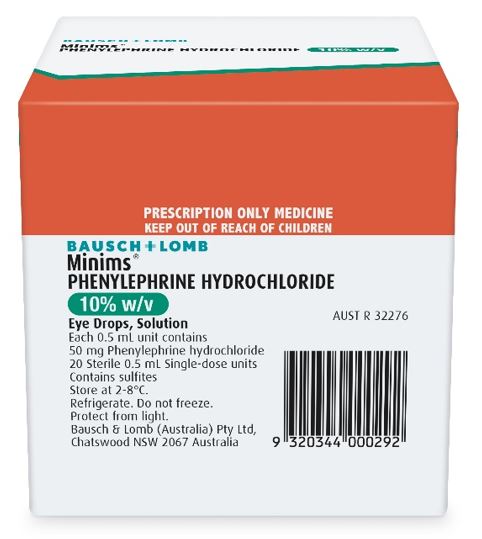 • Minims Phenylephrine Hydrochloride 10.0% is a directly acting sympathomimetic agent used topically in the eye as a mydriatic. Minims Phenylephrine Hydrochloride Eye Drops are indicated to dilate the pupil for diagnostic or therapeutic procedures.