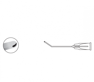The Bishop Harmon Cannula is bent at 40 degrees, 8mm from the tip.