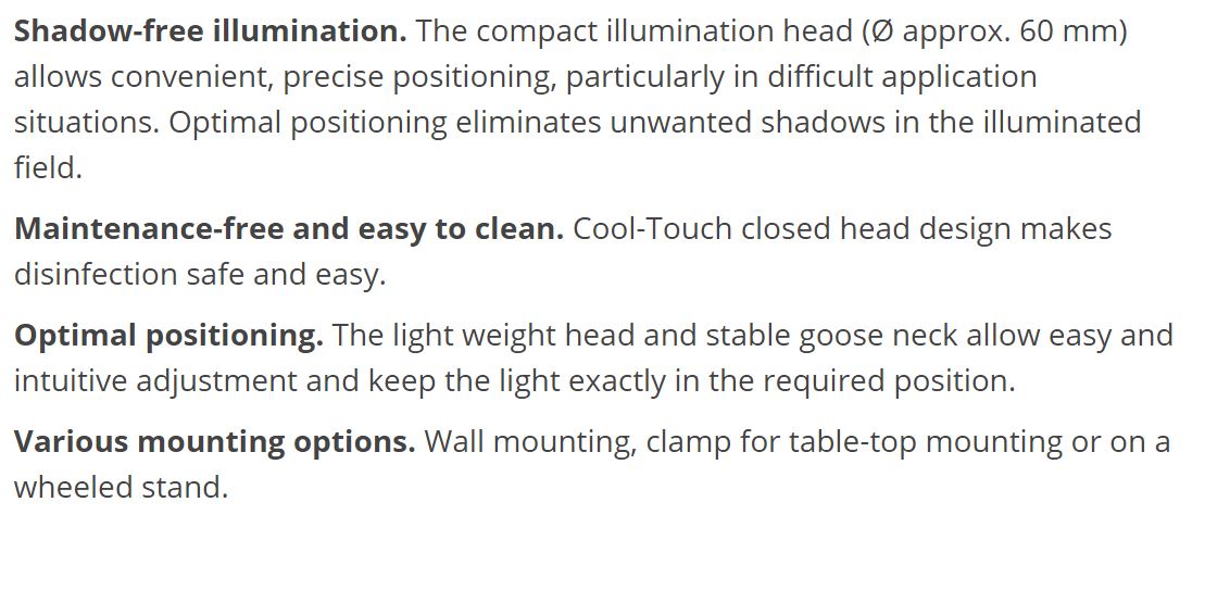 - Optimal positioning. The light weight head and stable goose neck allow easy and intuitive adjustment and keep the light exactly in the required position.