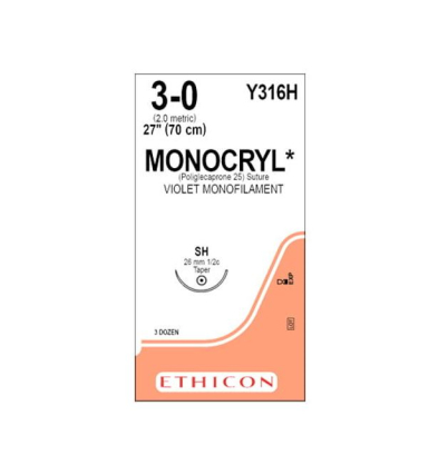 MONOCRYL® is an absorbable, undyed monofilament suture comprised of a synthetic material called Poliglecaprone 25. The material is derived from copolymer of glycolide and epsilon-caprolactone. This suture has a medium tensile strength in the colour violet. Due to being absorbable, should not be used where extended approximation of tissue under stress is required, such as in fascia.