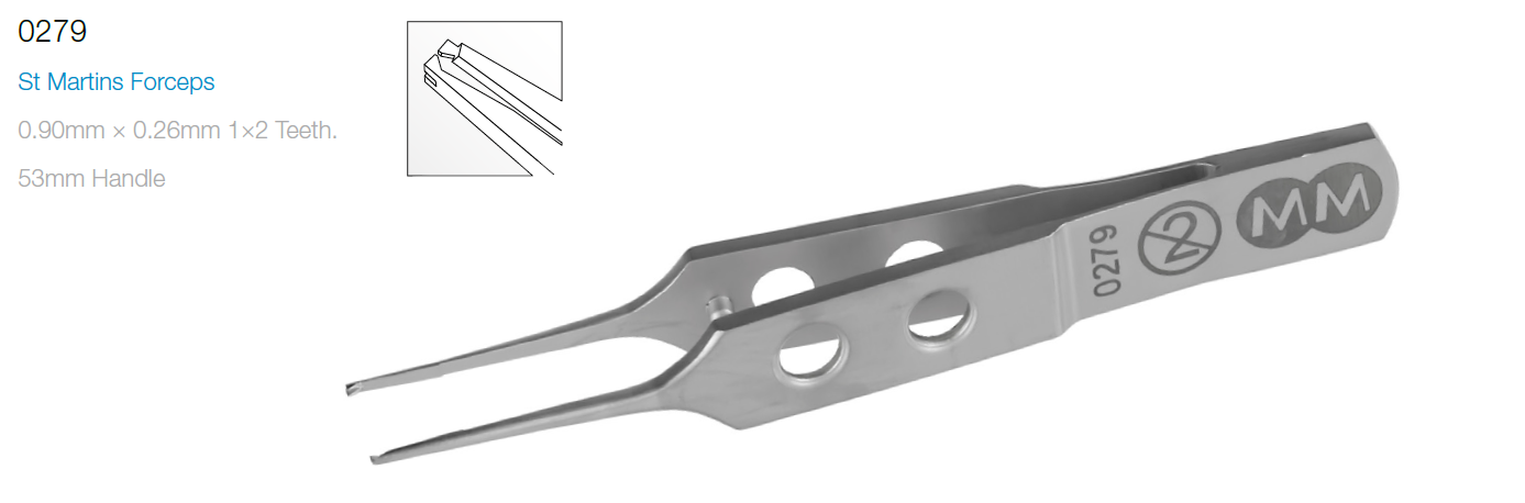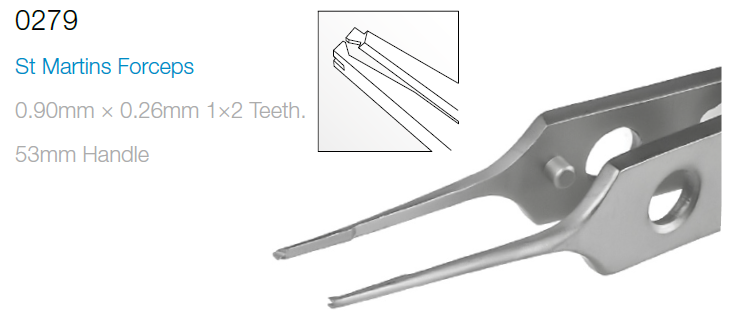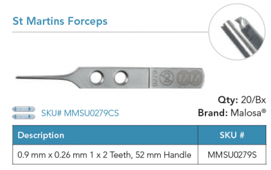 The St Martin Forceps are a versatile microsurgical instrument used most commonly in ophthalmologic and plastic procedures near the eyes. The forceps are used to hold both tissue and suture materials. This product is straight with 1×2 teeth on a smooth tying platform, and a handle length of 52 mm.