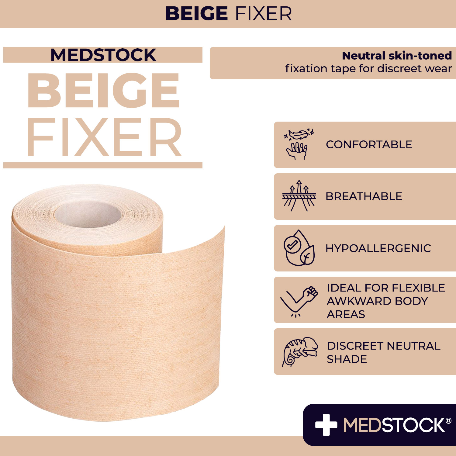 Medstock Beige Fixer is a non-woven, adhesive fabric roll that is designed in a neutral skin tone and used for securing a wide variety of primary dressings and other medical devices to the skin.