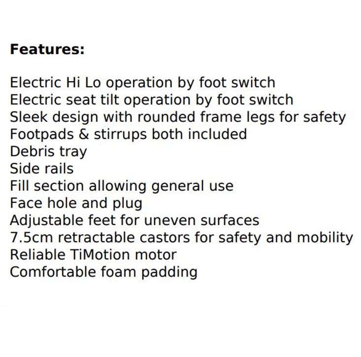 Everything you will need for women’s health and general examinations all in one table. This flexible table includes foot pads, stirrups, debris tray, a fill section & nose hole with plug allowing for a multitude of different examinations & treatments. It features a smooth hi-lo adjustment & electric seat tilt with foot control for optimum manoeuvrability and better patient treatment.