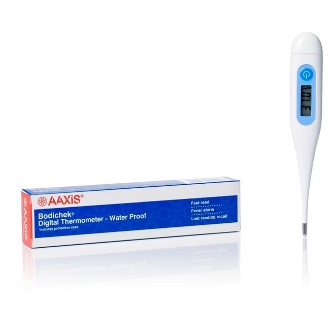 The Bodichek Rigid Tip Digital Thermometer offers quick, highly accurate temperature readings for oral, rectal, and underarm applications, with a measuring range of 32 to 42.9 degrees Celsius. It comes with a convenient storage case.