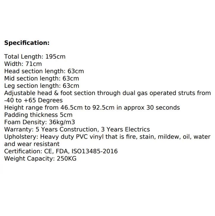 Adjustable head & foot section through dual gas operated struts from to -40 to +65 Degrees