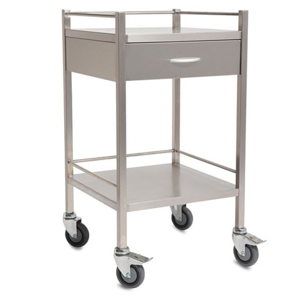 A high grade single drawer stainless steel trolley with smooth rolling castors, shelf, rails and an outstanding finish.