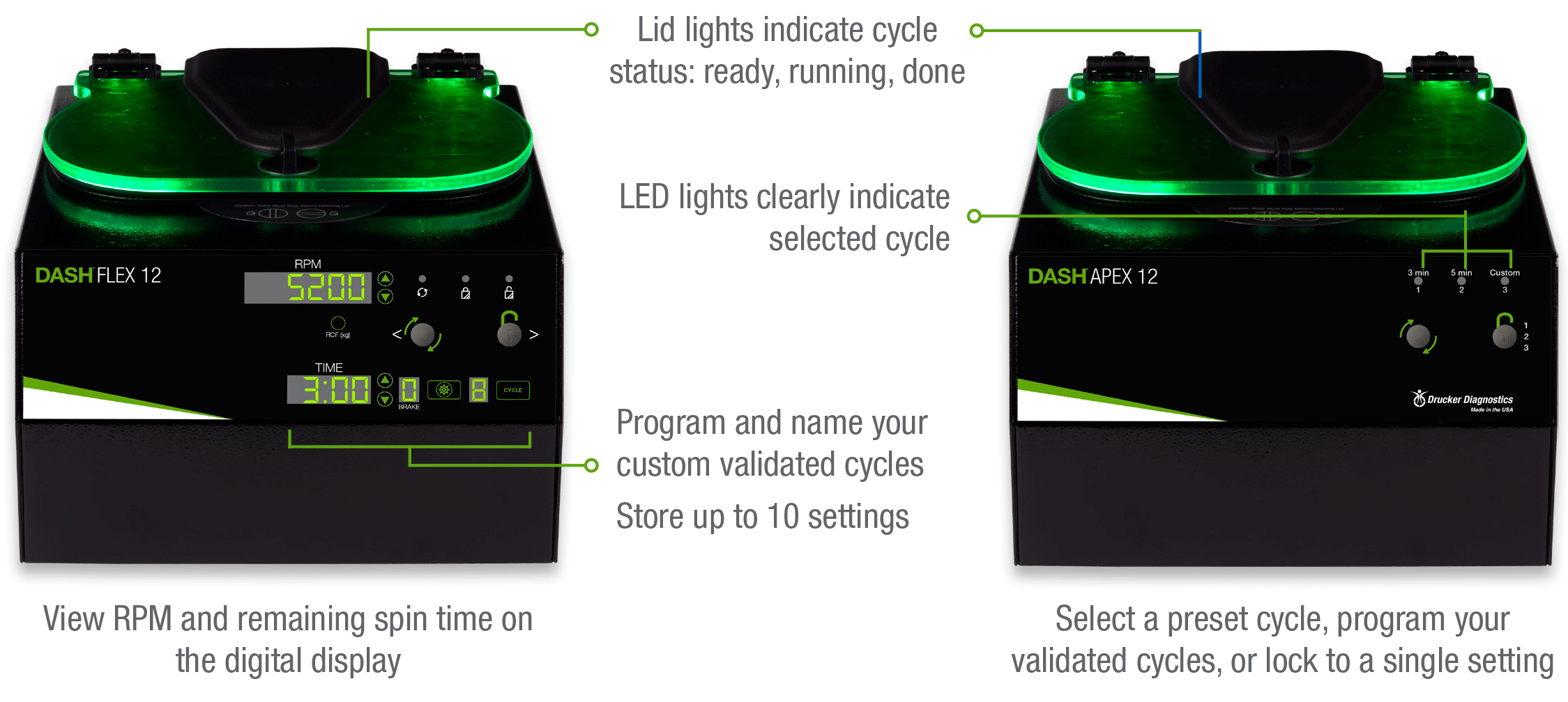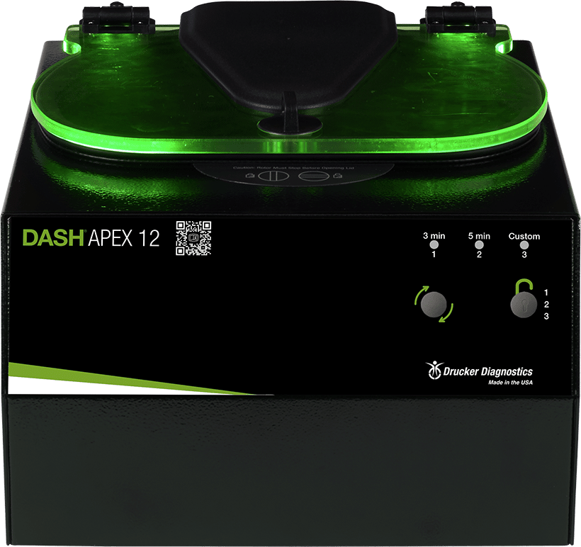 The DASH Apex 12 STAT centrifuge offers simple controls and powerful performance to minimize lab error, reduce turnaround time, and streamline training. The user-friendly two-button interface makes it easier than ever to select a preset or program your custom validated STAT cycles. LED lid lighting indicates when the centrifuge is ready to load (off), running (on), or done (flashing) and prevents forgotten samples, even in the busiest labs. Each centrifuge comes ready to run with the rotor, tube holders, and warranty included in the affordable price.