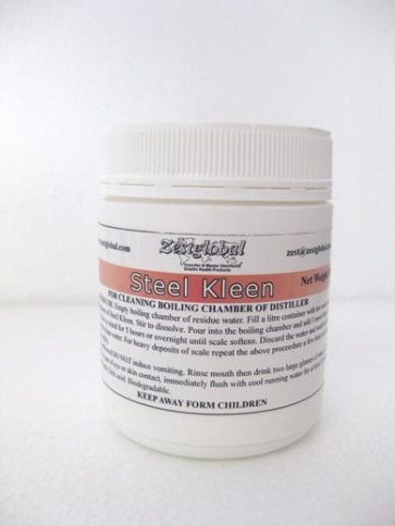 Steel Kleen (500g tub) cleaning solution is used for cleaning the boiling chamber of a distiller.