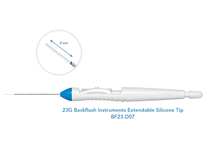 BF23.D07 is a 23G disposable & extendable backflush instrument. The 8mm extendable silicone tip is used for draining fluid from behind retina and other standard backflush procedures.