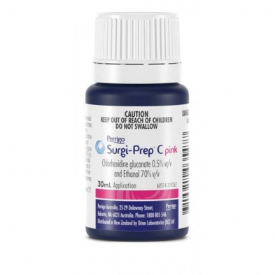 Surgi-Prep C+ bright pink tint and distinguishable blue bottles helps with product identification, providing a visual cue that the liquid is non-injectable which assists with patient safety. Suitable for dry and moist sites including groin and armpit.