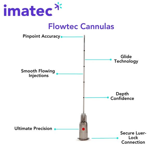 The Imatec Medical Flowtec Dermal Filling Micro-Cannula is sold in boxes of 20 designed to enhance precision, safety, and patient comfort during aesthetic procedures. With advanced engineering and thoughtful features, it provides professionals with the reliability and control they need for optimal results.