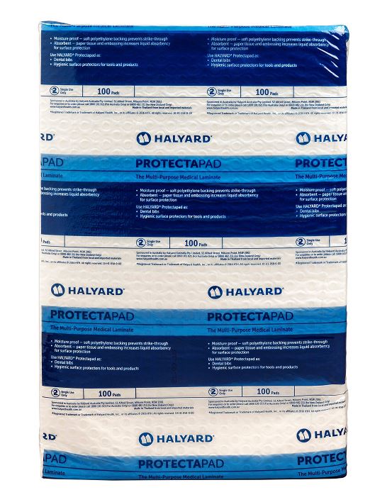 • HALYARD* Protectapad Softness ensures optimum patient comfort and also assists with cushioning and protecting instruments. Laminated for extra strength wet or dry and is single-use, making it the hygienic choice to protect patients and surfaces from staining and other spills.