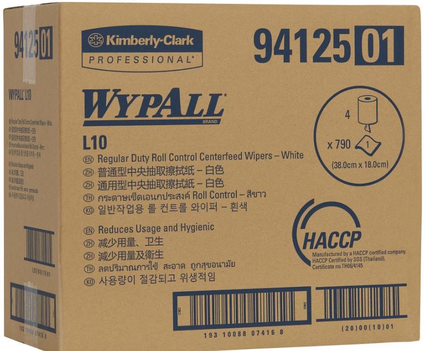 • Each roll of WYPALL® L10 Roll Control Centrefeed Wipers contains 790 wipers and is 300m in length.