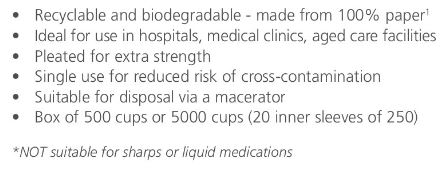 Haines® Paper Pill Cups avoid cross-contamination and provide easy distribution of medication. They are an environmentally-friendly and cost effective alternative to plastic pill cups for placing medicine in to assist swallowing medication.