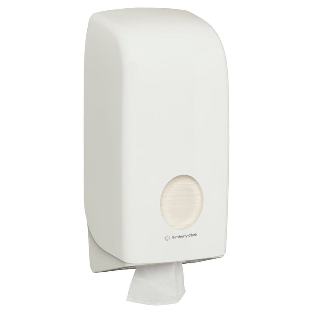 The KIMBERLY-CLARK PROFESSIONAL® AQUARIUS® toilet tissue dispenser with single sheet dispensing ensures the user touches only the toilet tissue they use promoting good hygiene in the washroom as well as limiting waste and overuse. And touch-free dispensing enables the user to retrieve the toilet tissue without touching the dispenser, further promoting good hygiene practices.Featuring a contemporary design in white high-gloss ABS plastic, with smooth and continuous surfaces making it easy to clean whilst also blending seamlessly into your workplace.