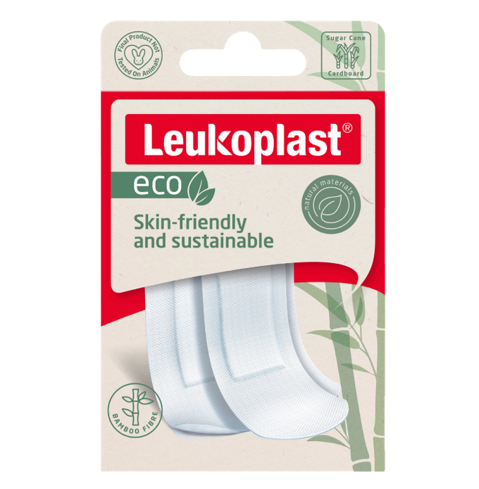 Leukoplast eco strips and dressing lengths consist of a skin-friendly, white bamboo woven fabric, and are sustainably made with at least 90% natural, renewable materials used in the product and the packaging. These soft and highly absorbent wound dressings are reliably adhesive and comfortable.