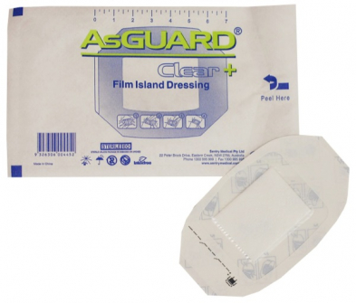 AsGUARD® Clear+ Film Island Dressing is a waterproof polyurethane film, that provides a low adherent and breathable absorbent pad, permeable to moisture. It is suitable wounds with a low level of exudate, minor wounds and post- operative for fragile skin.